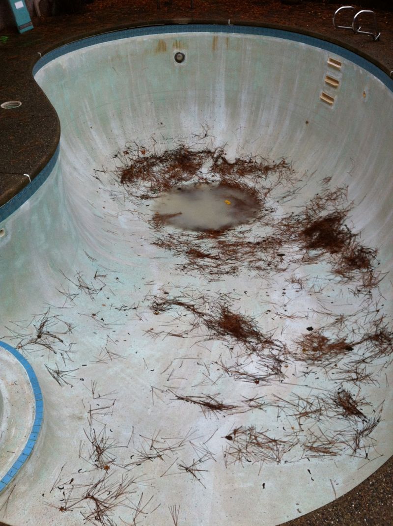 If we had drained it in Summer, this vintage 1972 kidney pool would have been a fantastic skate bowl. Unfortunately, it was drizzly and the sides of the pool were slick with goo. We were concerned about hydrostatic pressure after the pool had drained. Apparently, high groundwater can push an empty pool right out of the ground, like a big cement boat.